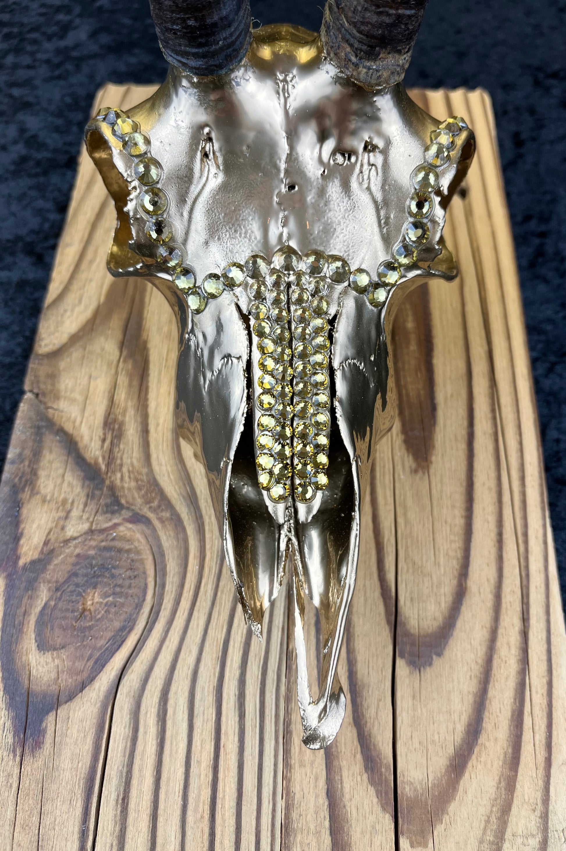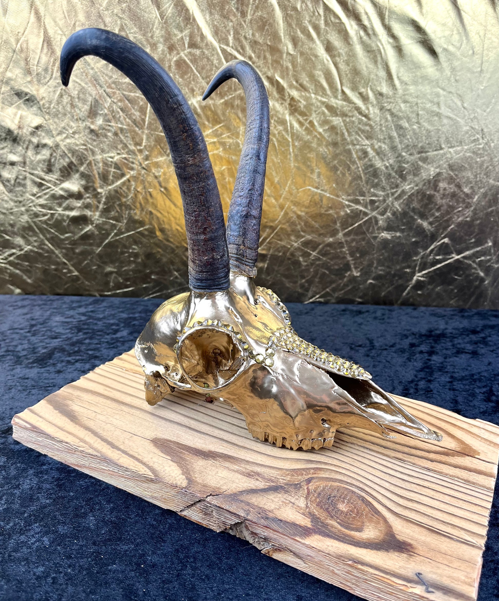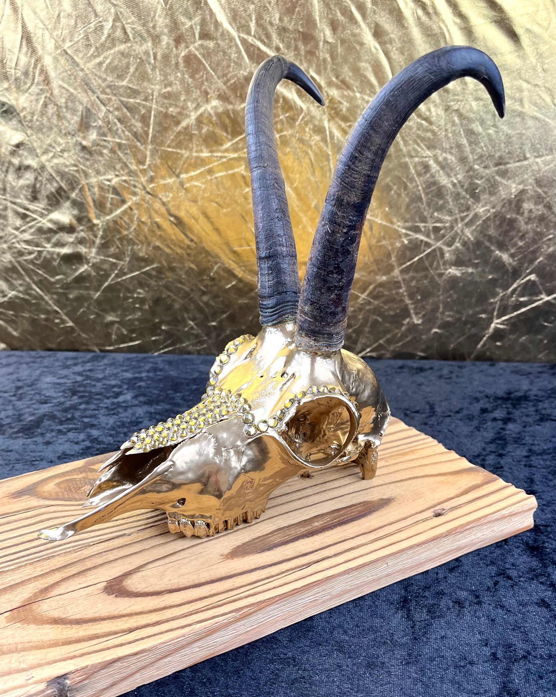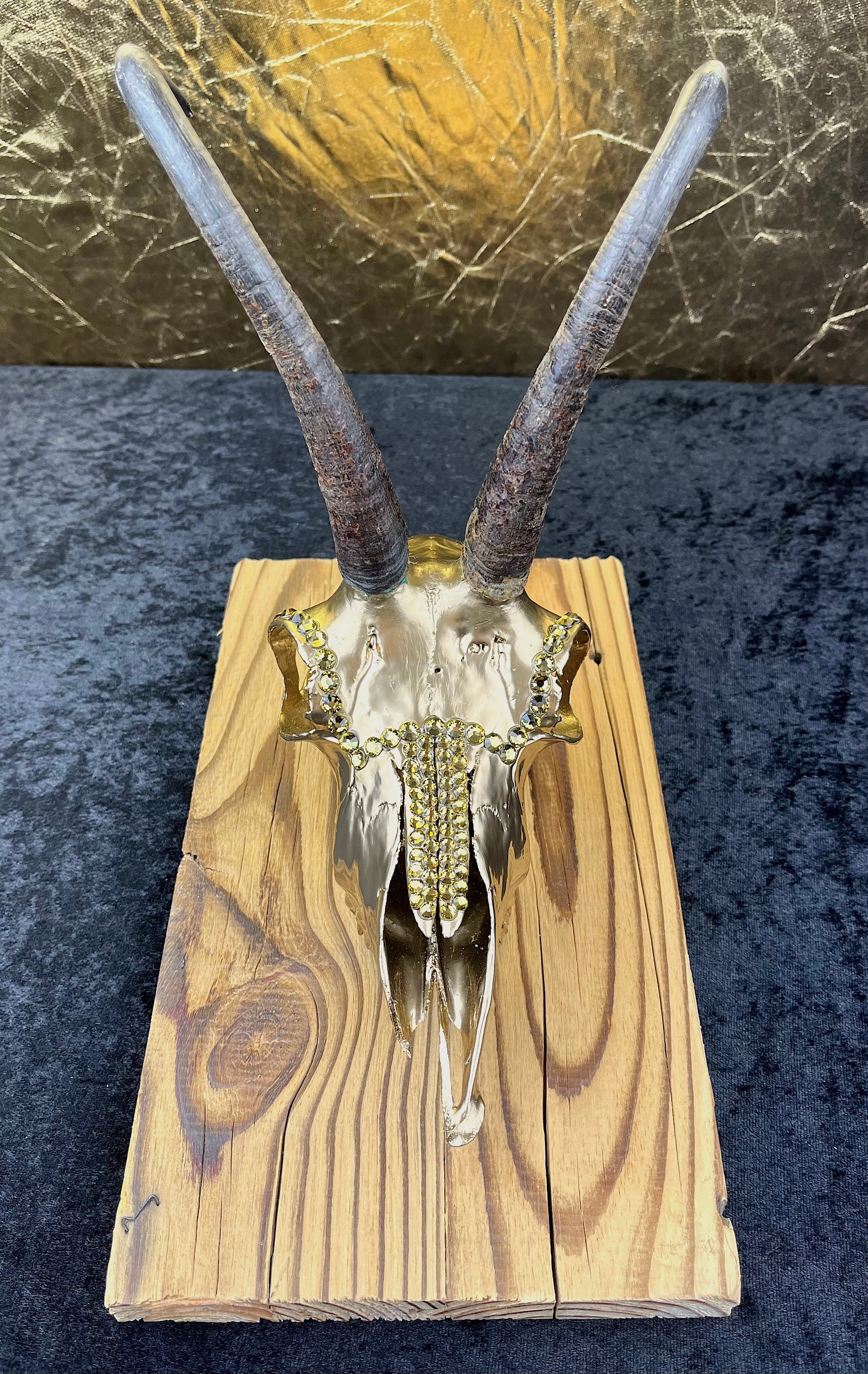 Der goldene Vollschädel und die kapitalen Krucken des Gamsbocks von den Bergen Tirols, sprechen für sich und gehen eine perfekte Symbiose ein. Zum vollendeten Interieur wird der Wandschmuck durch die Verwendung namhafter, hochwertiger, funkelnder Kristalle, die einzeln auf der Trophäe verklebt wurden.
