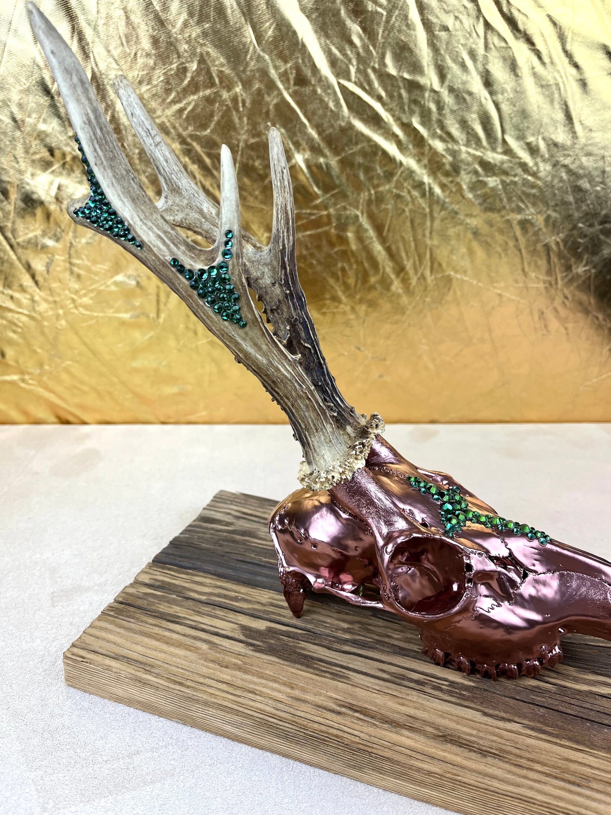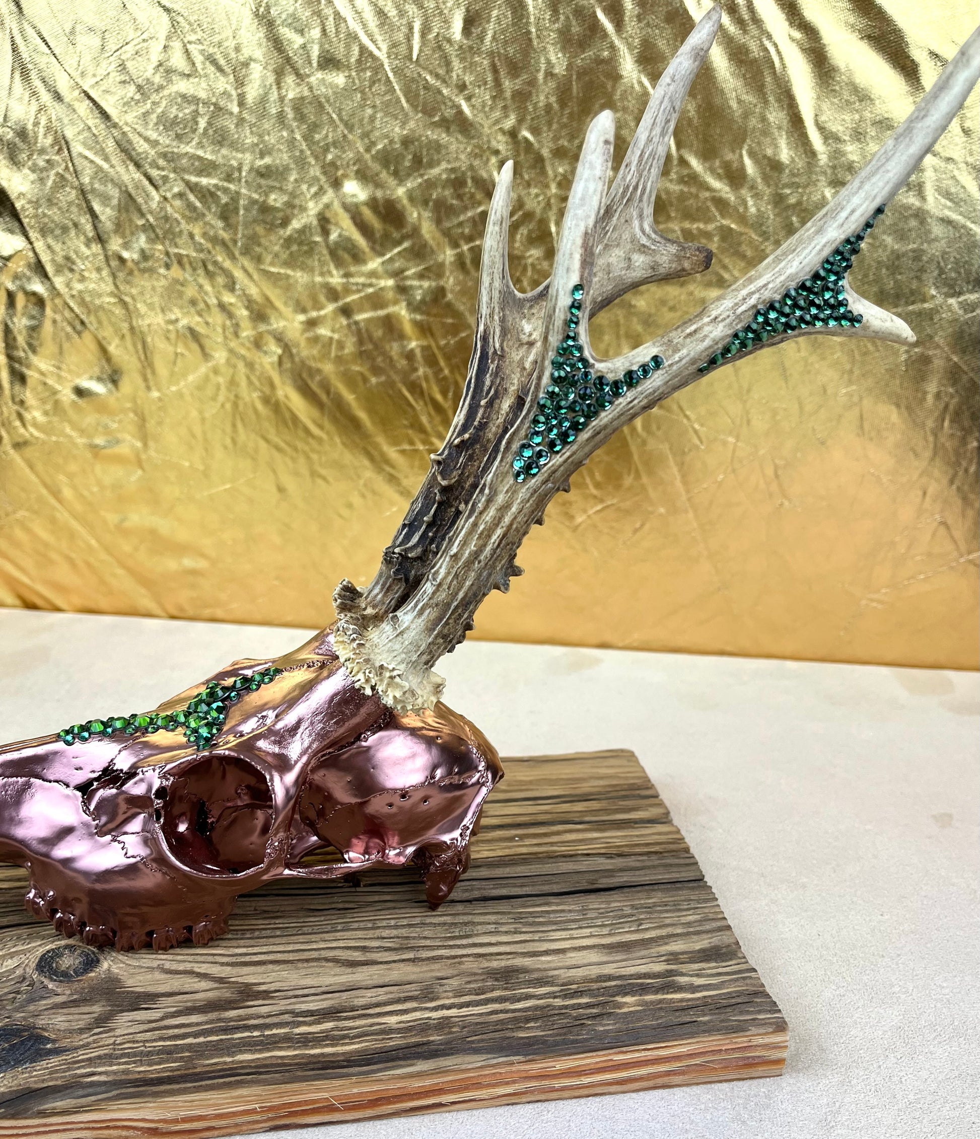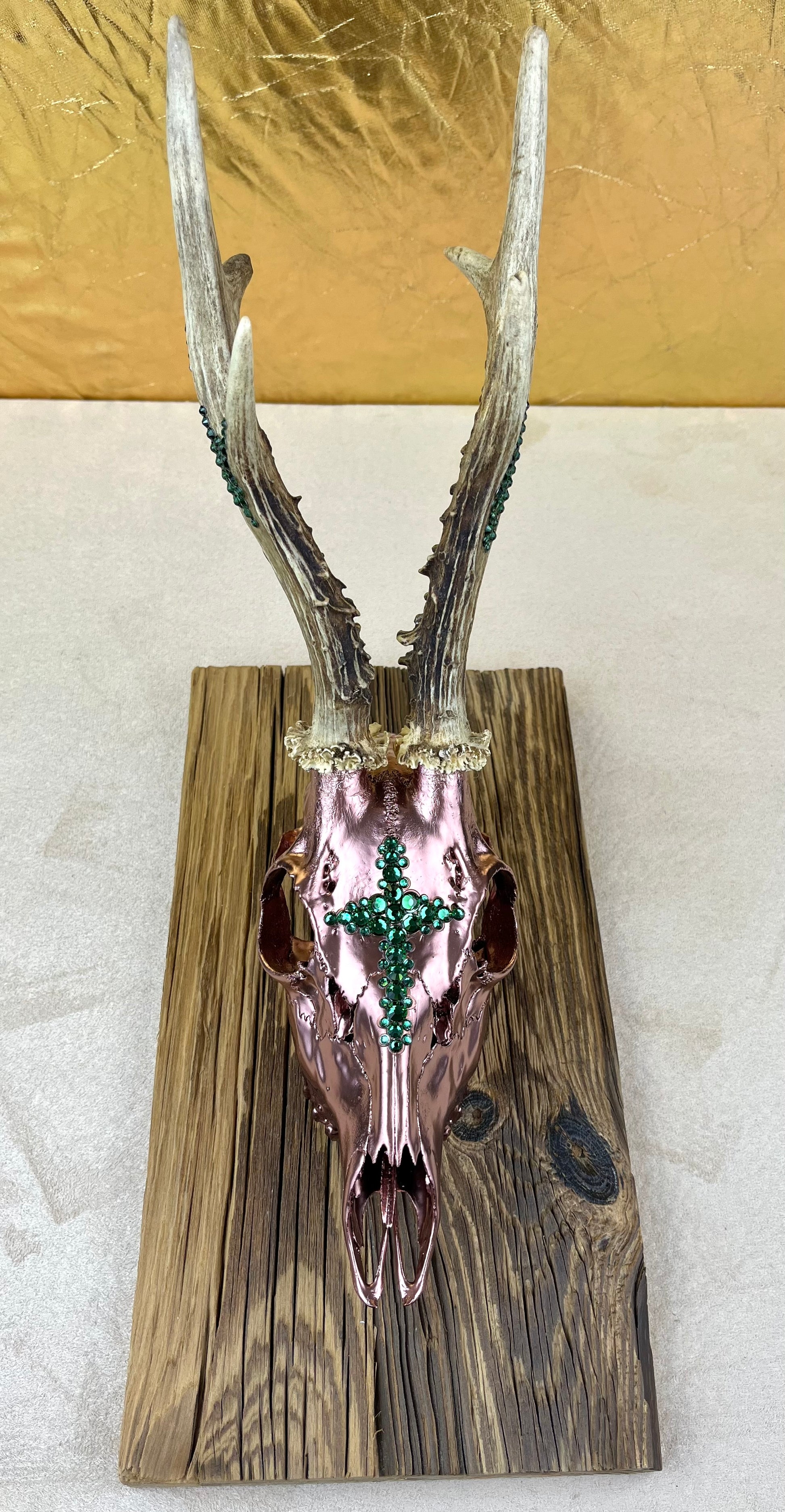 Das Altholz-Brett mit dem kupfernen Vollschädel und der kapitalen 6er-Trophäe aus den Wäldern Ungarns sprechen für sich und gehen eine perfekte Symbiose ein. Zum vollendeten Interieur wird der Wandschmuck durch die Verwendung namhafter, hochwertiger, funkelnder Kristalle, die einzeln auf der Trophäe verklebt wurden.