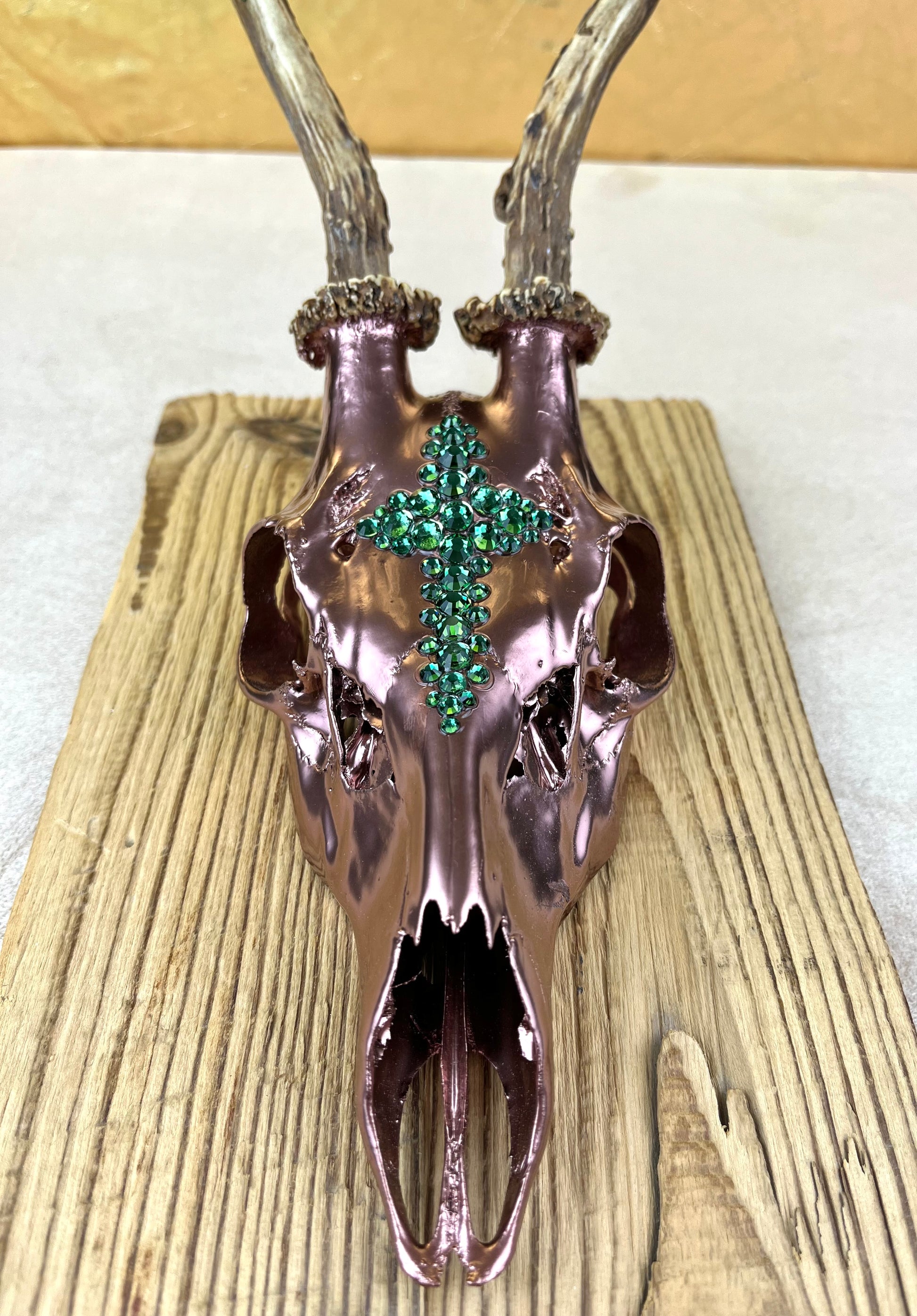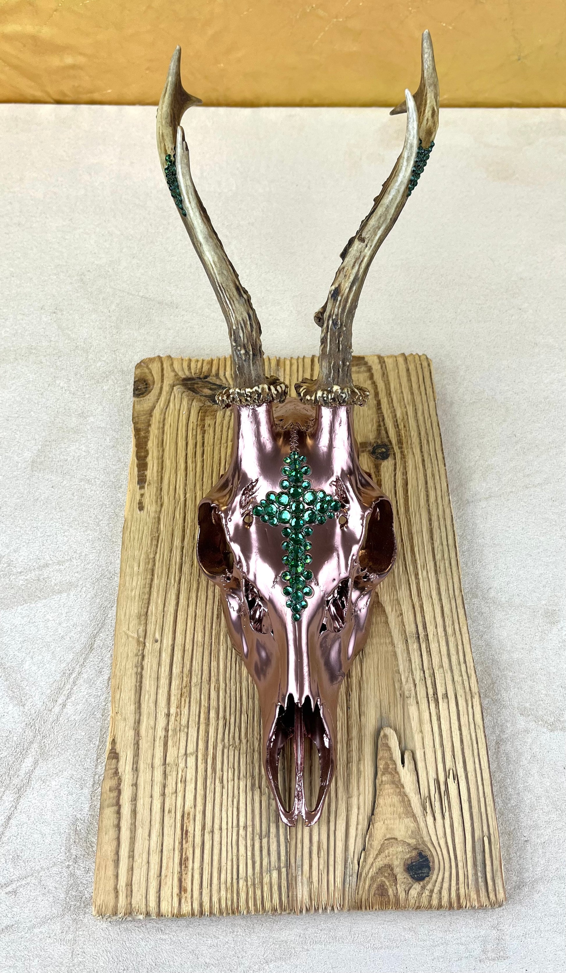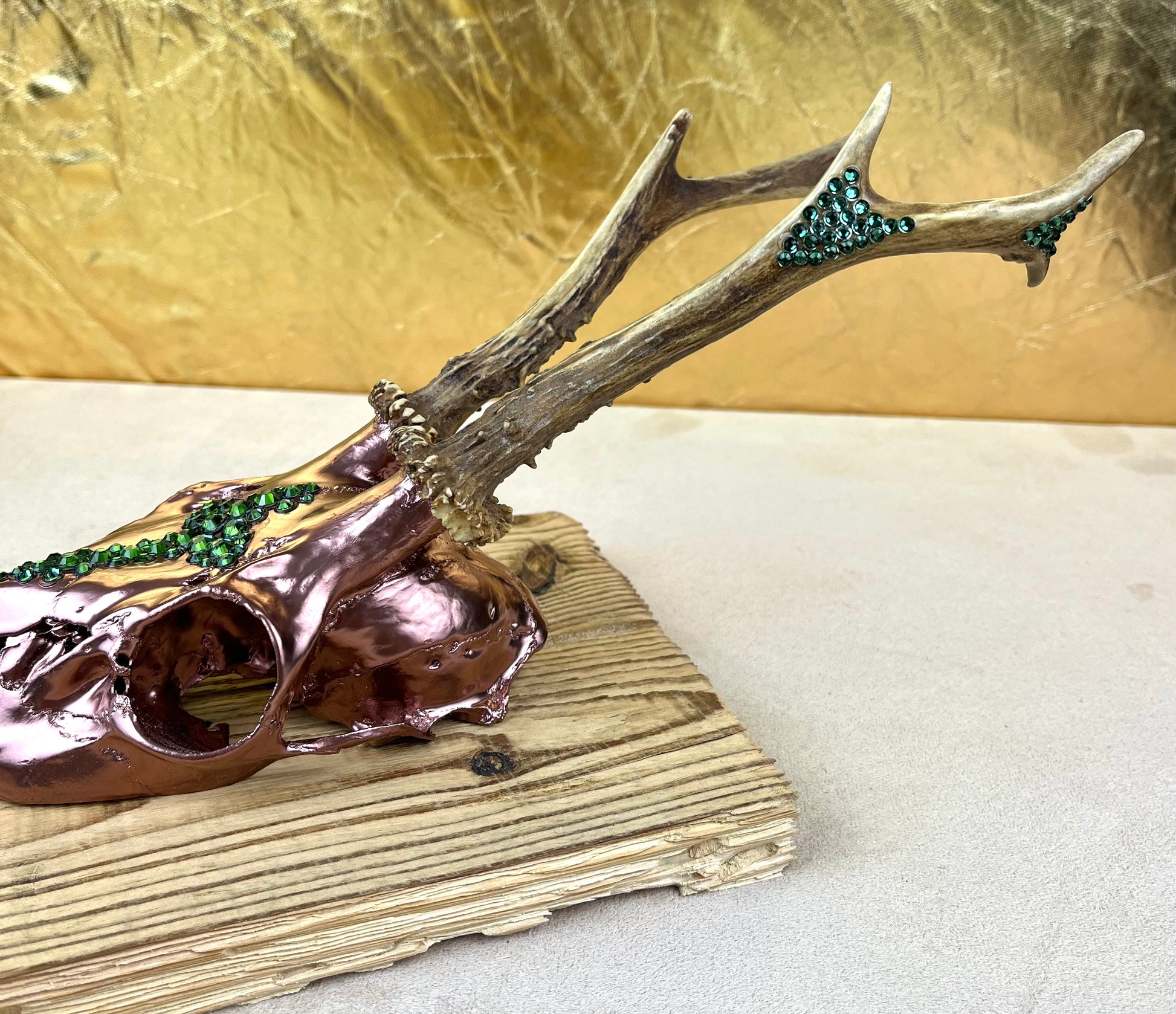 Das Altholz-Brett mit dem kupfernen Schädel und der 6er-Trophäe sprechen für sich und gehen eine perfekte Symbiose ein. Zum vollendeten Interieur wird der Wandschmuck durch die Verwendung namhafter, hochwertiger, funkelnder Kristalle, die einzeln auf der Trophäe verklebt wurden.