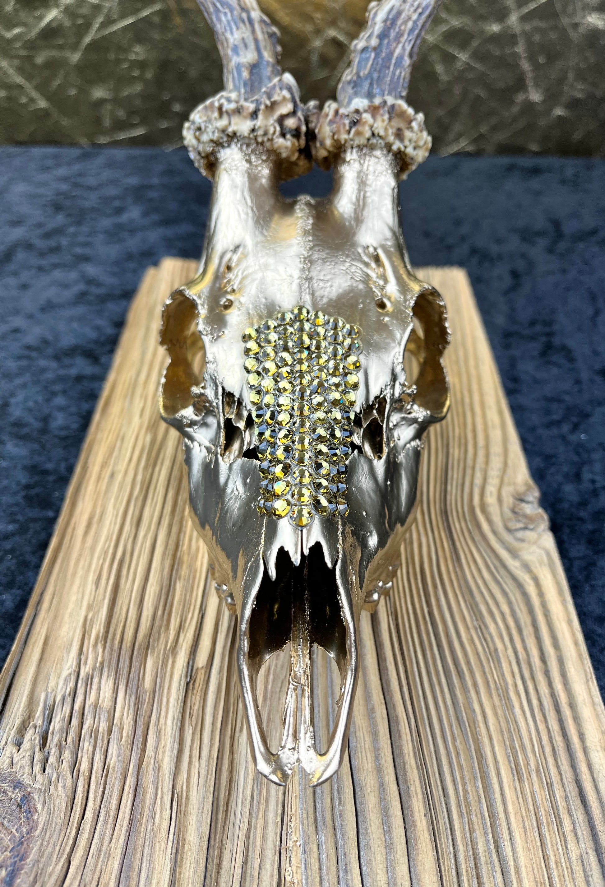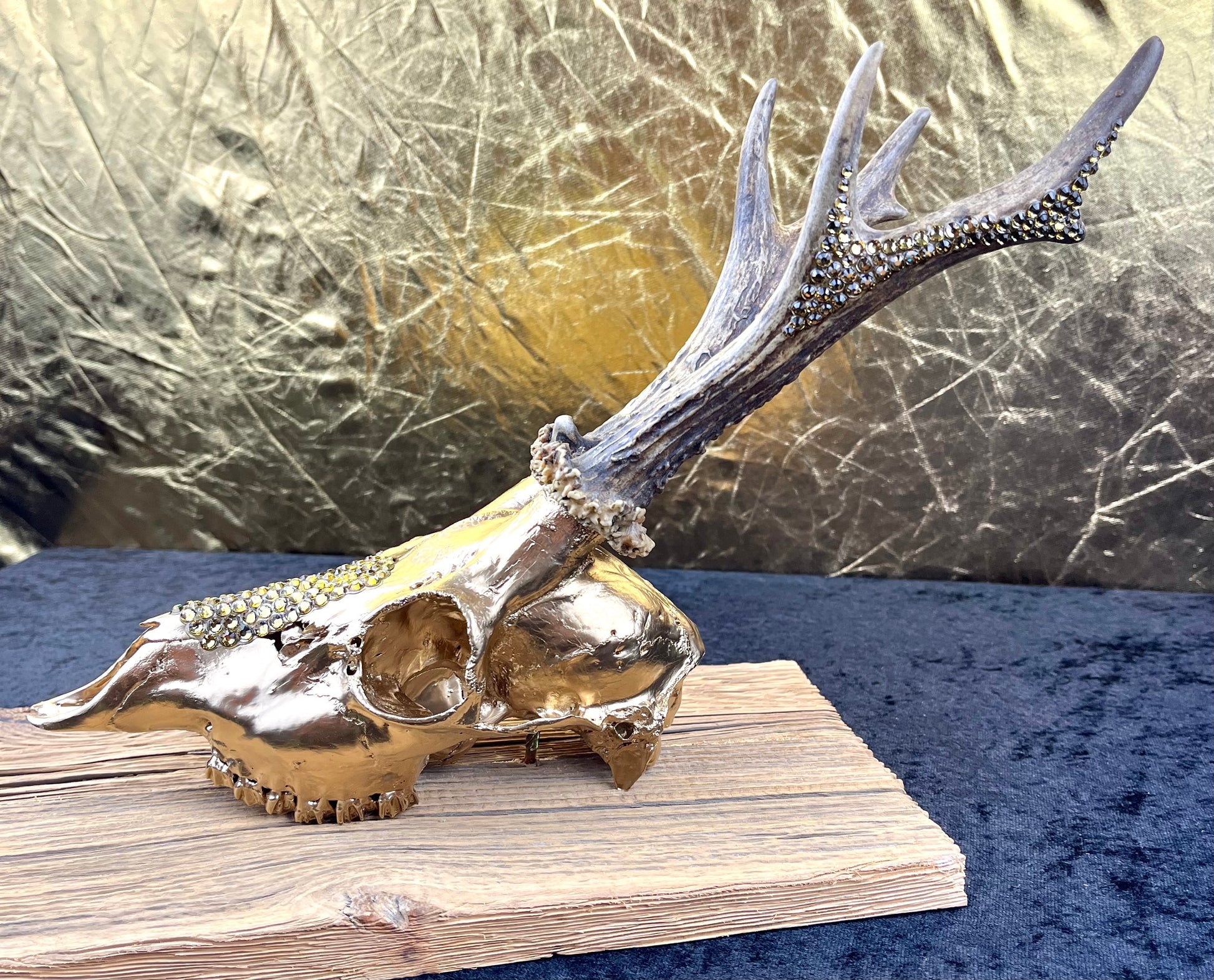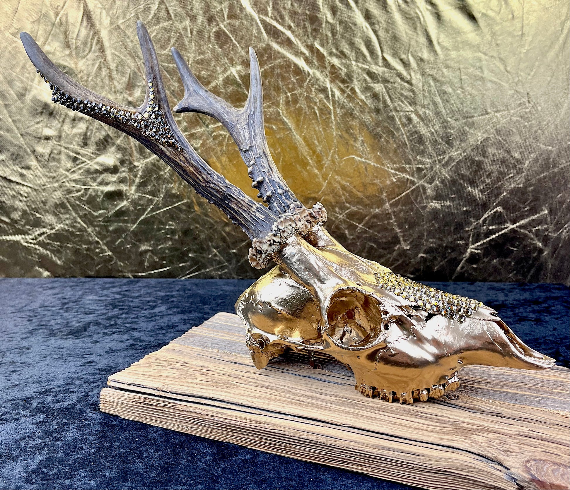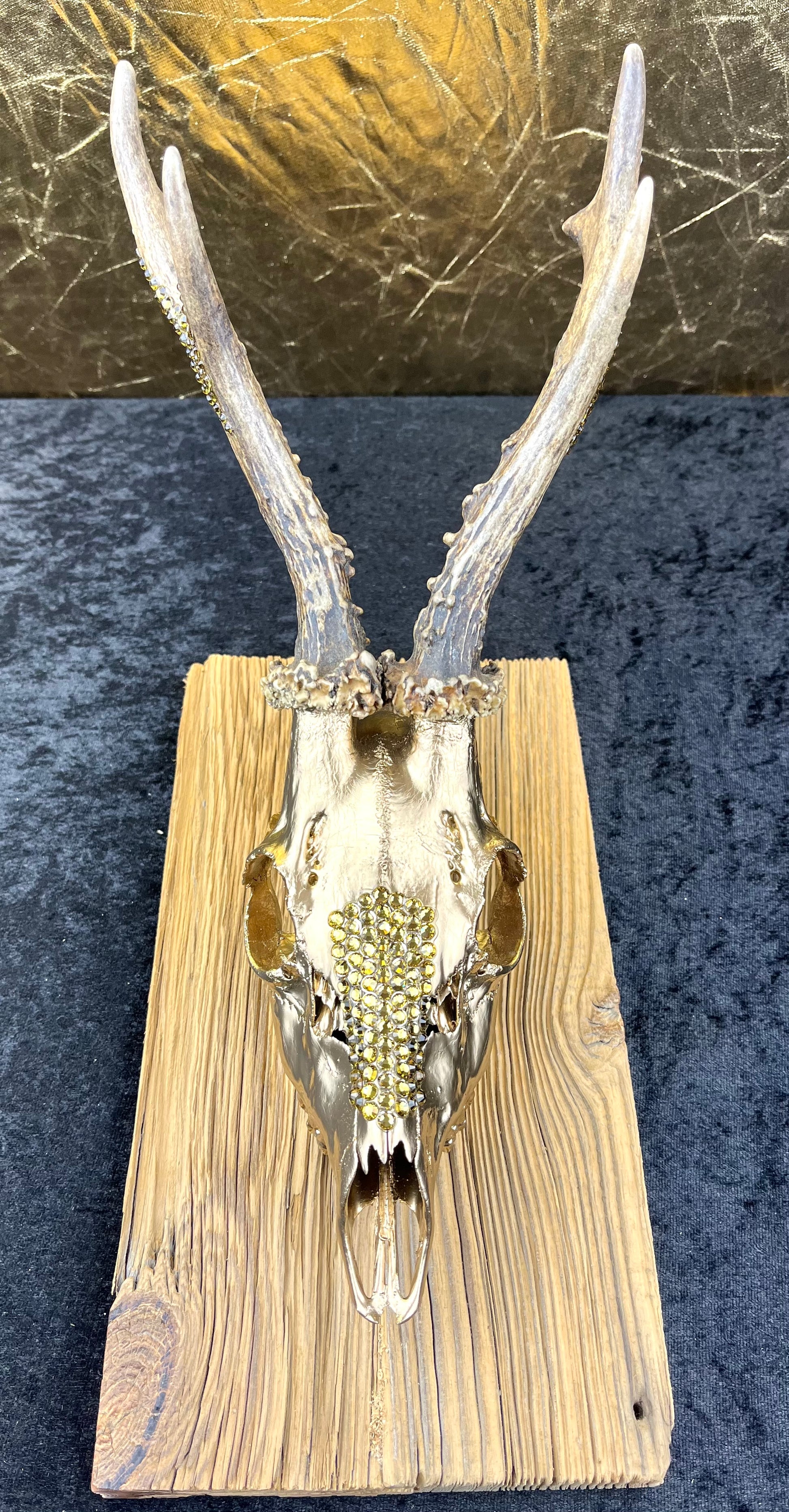 Das Altholz-Brett mit dem goldenen Vollschädel und der weit ausgestellten kapitalen 6er Trophäe aus den Wäldern Ungarns, sprechen für sich und gehen eine perfekte Symbiose ein. Zum vollendeten Interieur wird der Wandschmuck durch die Verwendung namhafter, hochwertiger, funkelnder Kristalle, die einzeln auf der Trophäe verklebt wurden.