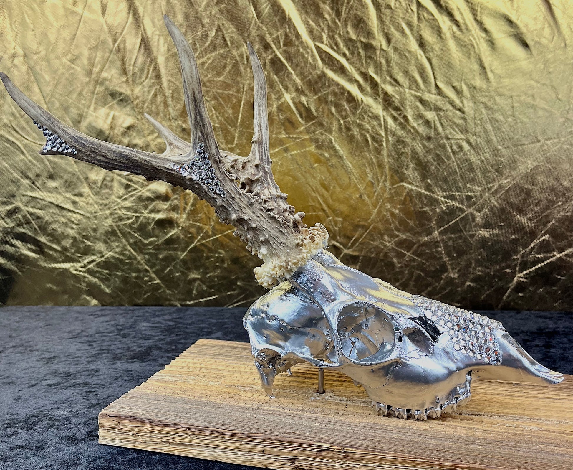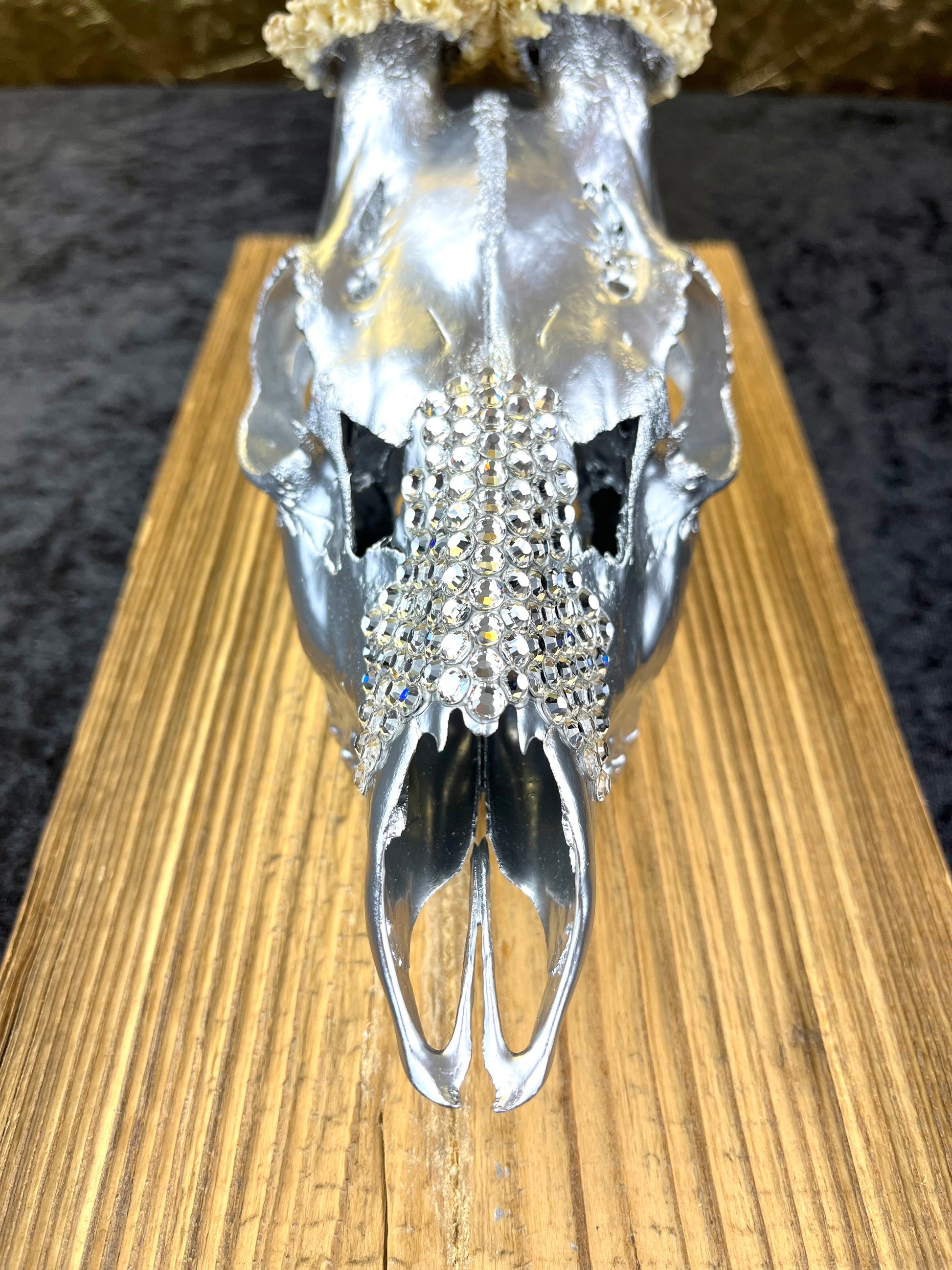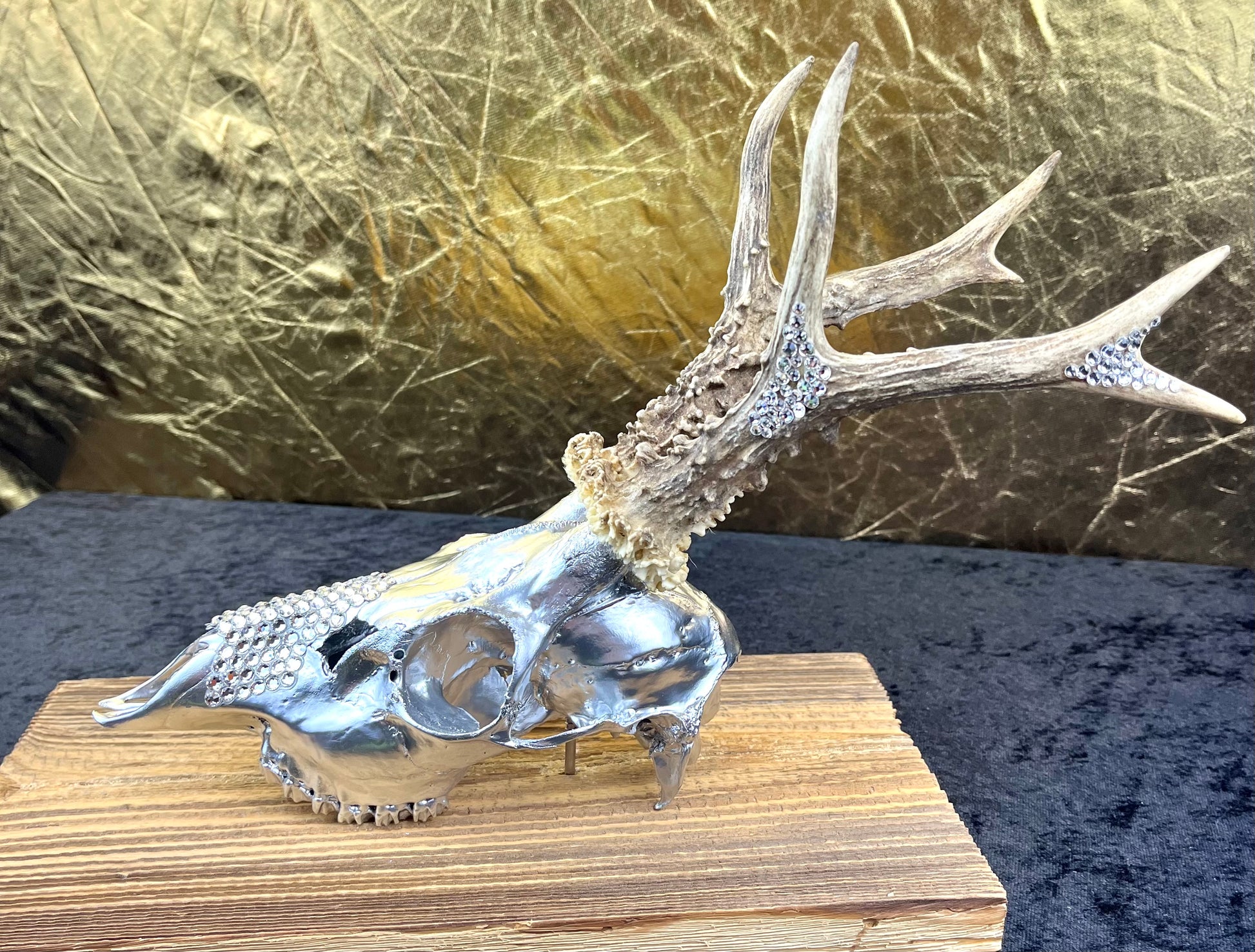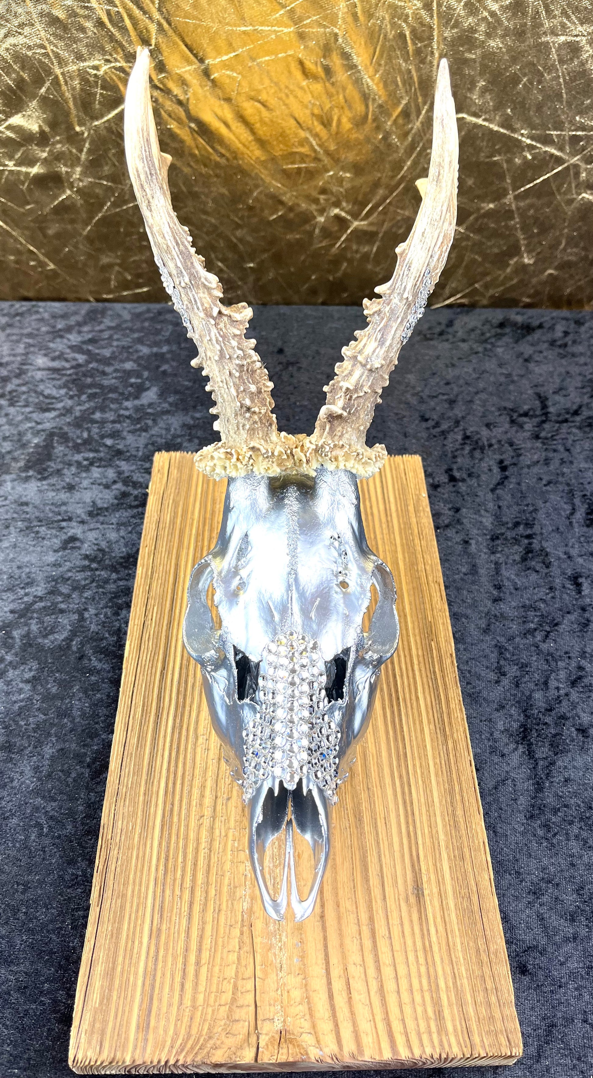Das Altholz-Brett mit dem silbernen Vollschädel und der weit aufgestellten kapitalen 6er Trophäen aus den Wäldern Ungarns, sprechen für sich und gehen eine perfekte Symbiose ein. Zum vollendeten Interieur wird der Wandschmuck durch die Verwendung namhafter, hochwertiger, funkelnder Kristalle, die einzeln auf der Trophäe verklebt wurden.