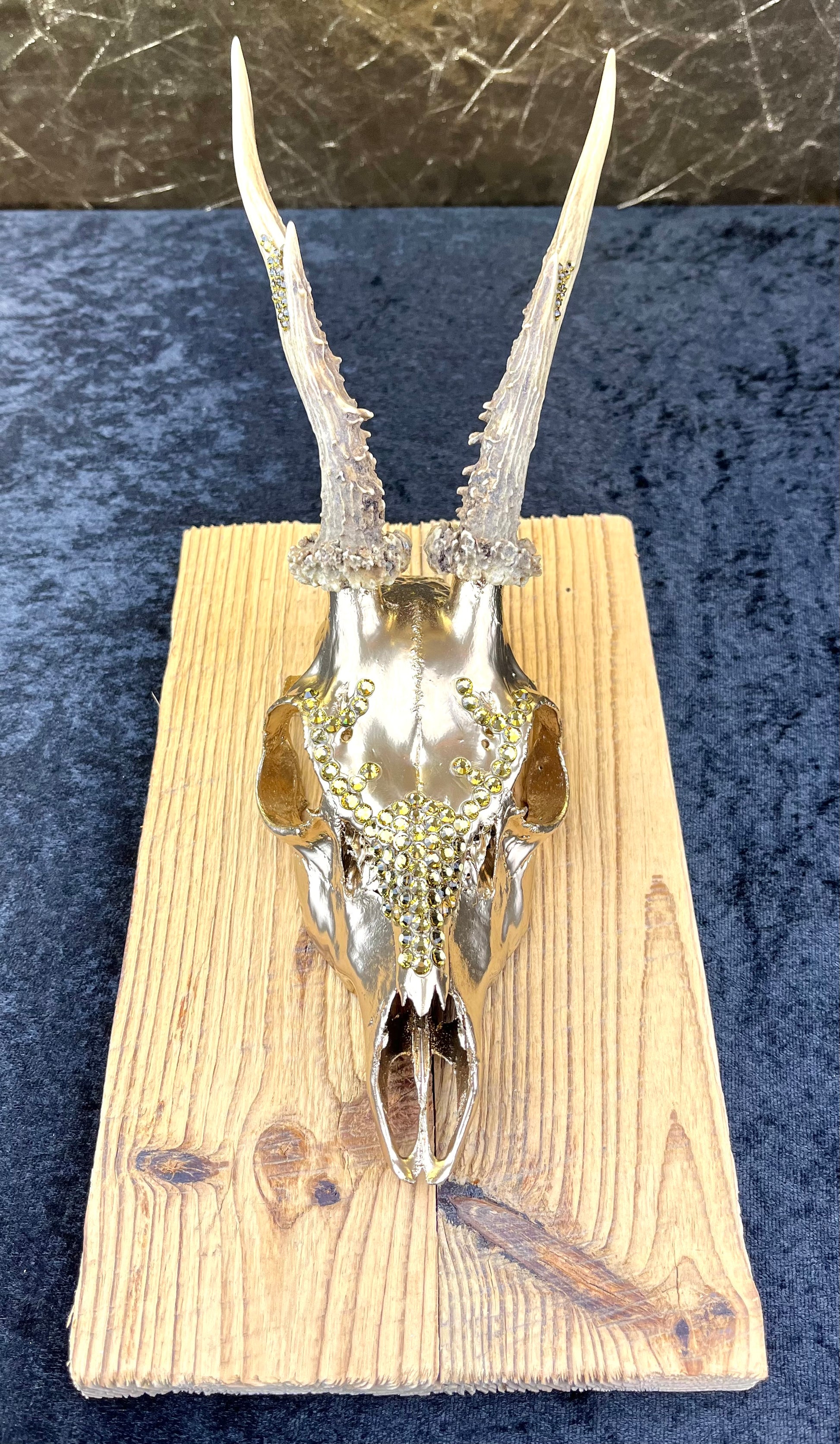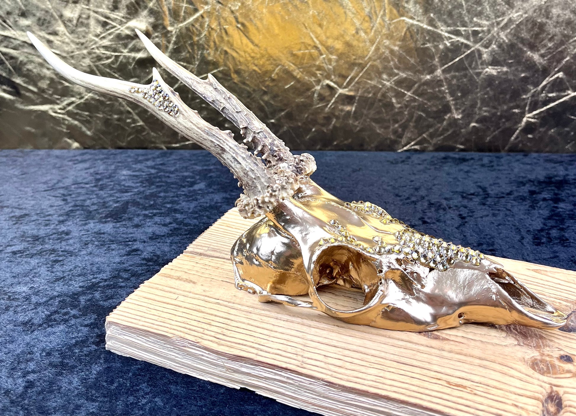 Das Altholz-Brett mit dem goldenen Schädel und der Gabler-Trophäe sprechen für sich und gehen eine perfekte Symbiose ein. Zum vollendeten Interieur wird der Wandschmuck durch die Verwendung namhafter, hochwertiger, funkelnder Kristalle, die einzeln auf der Trophäe verklebt wurden.