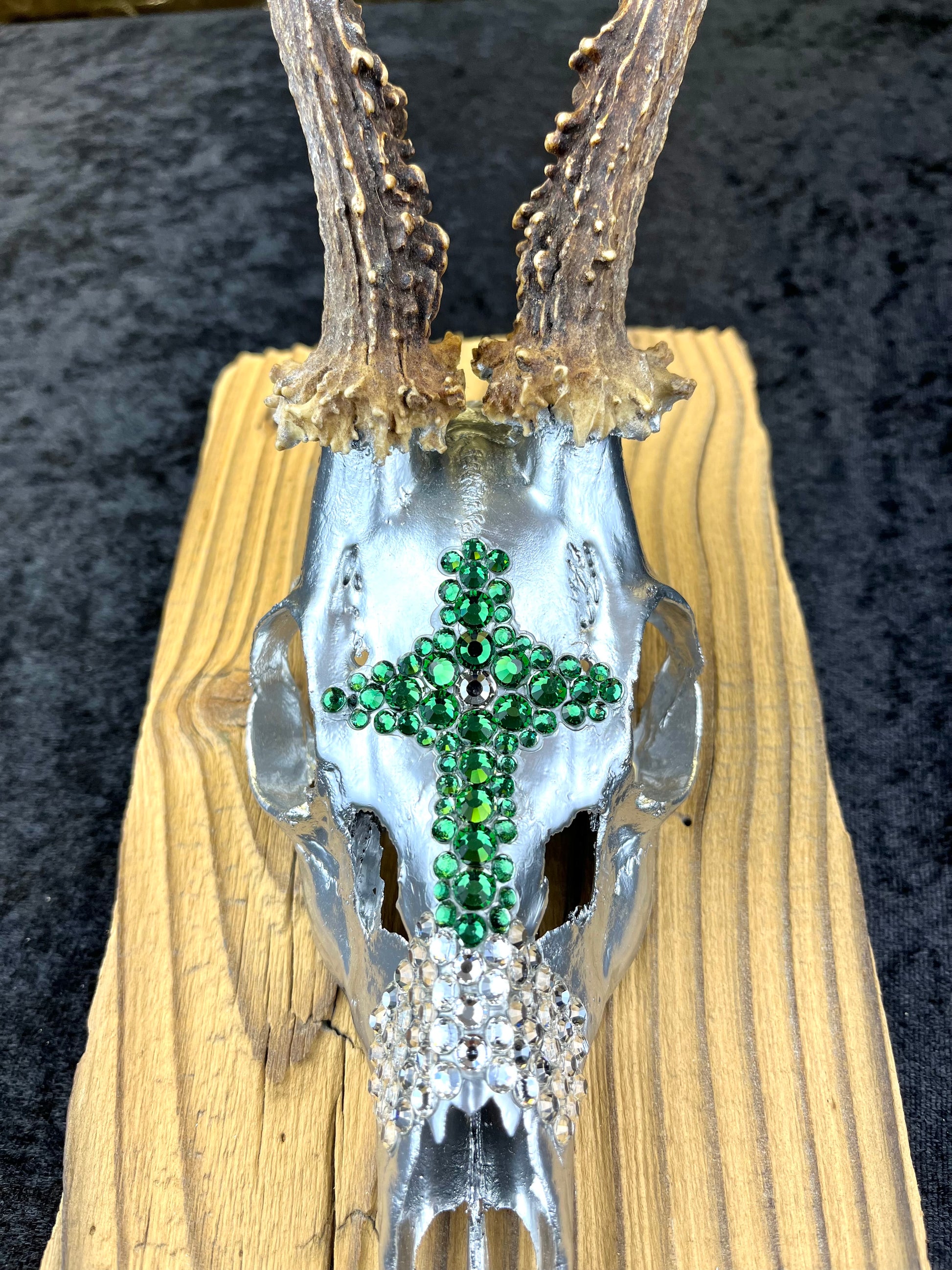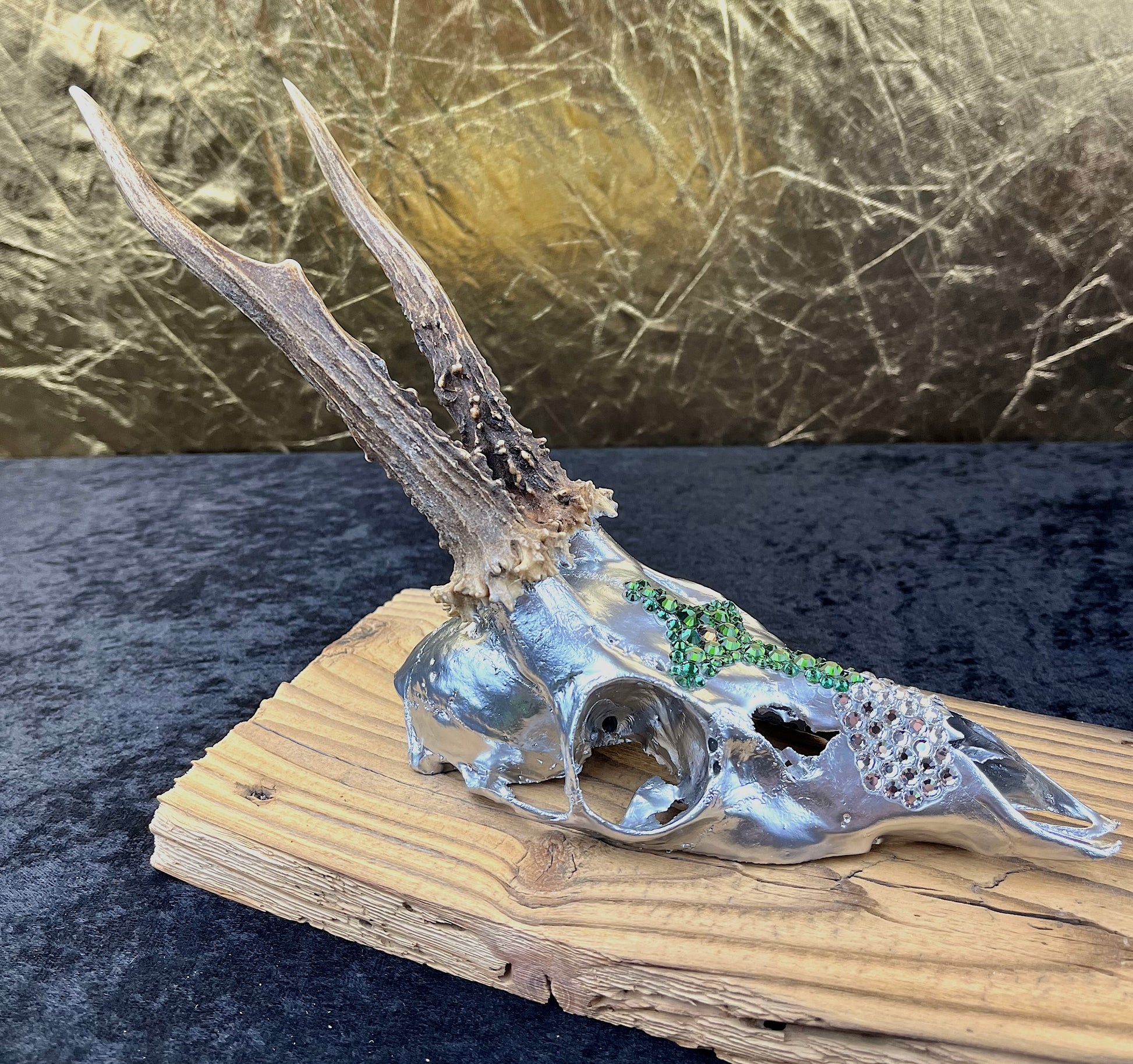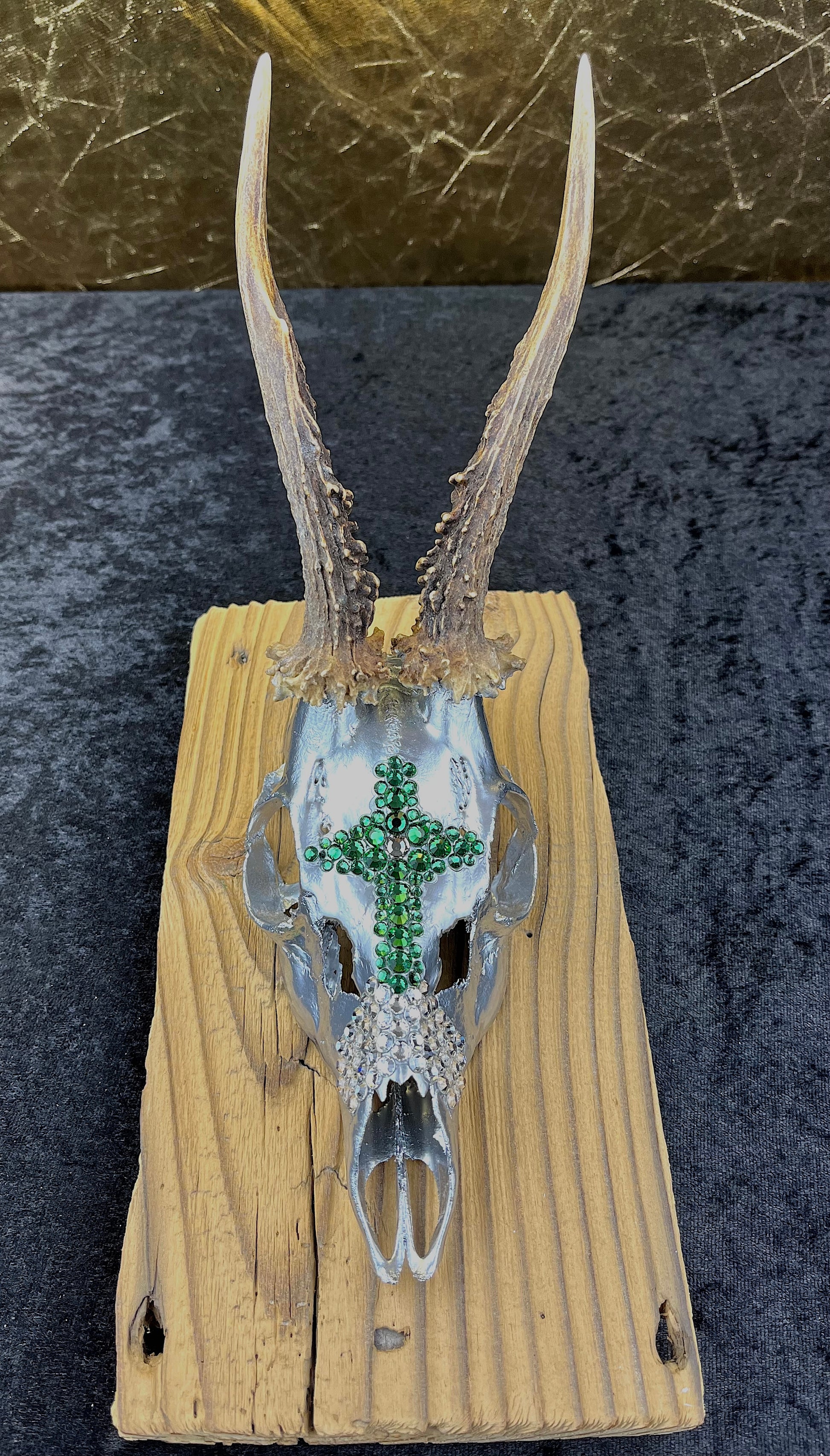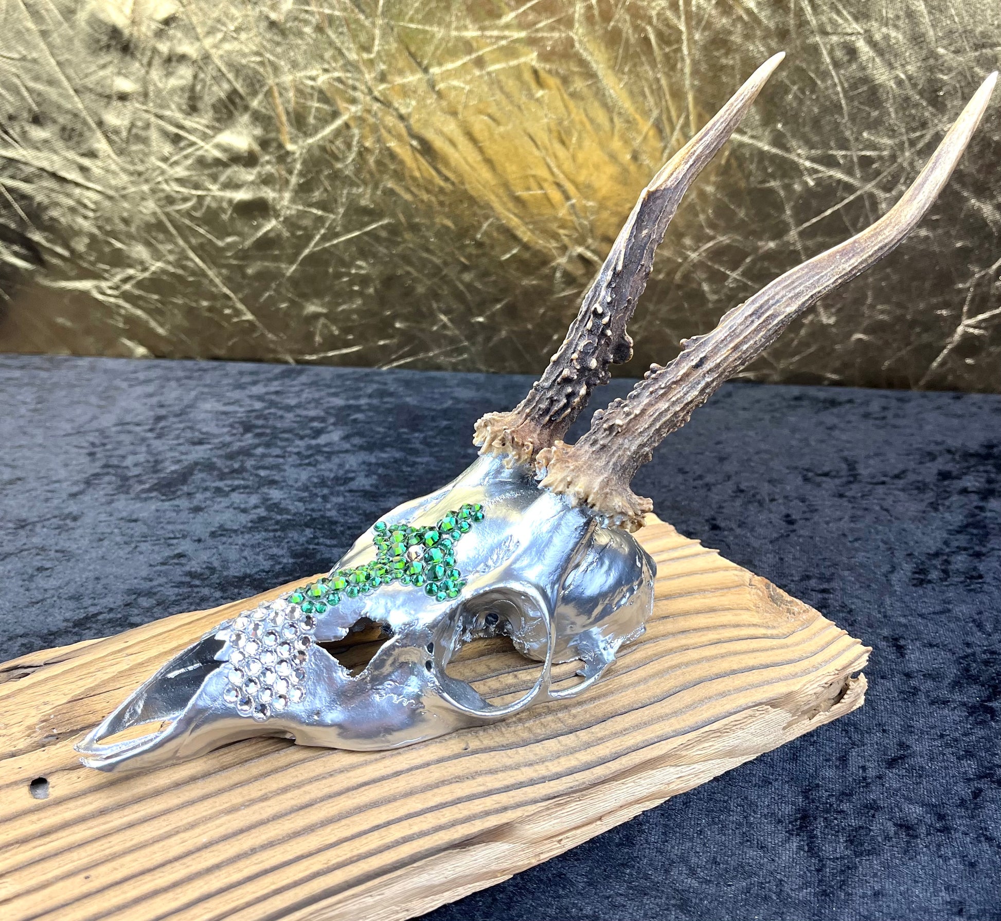 Das Altholz-Brett mit dem silbernem Schädel und der Spießer-Trophäe sprechen für sich und gehen eine perfekte Symbiose ein. Zum vollendeten Interieur wird der Wandschmuck durch die Verwendung namhafter, hochwertiger, funkelnder Kristalle, die einzeln auf der Trophäe verklebt wurden.